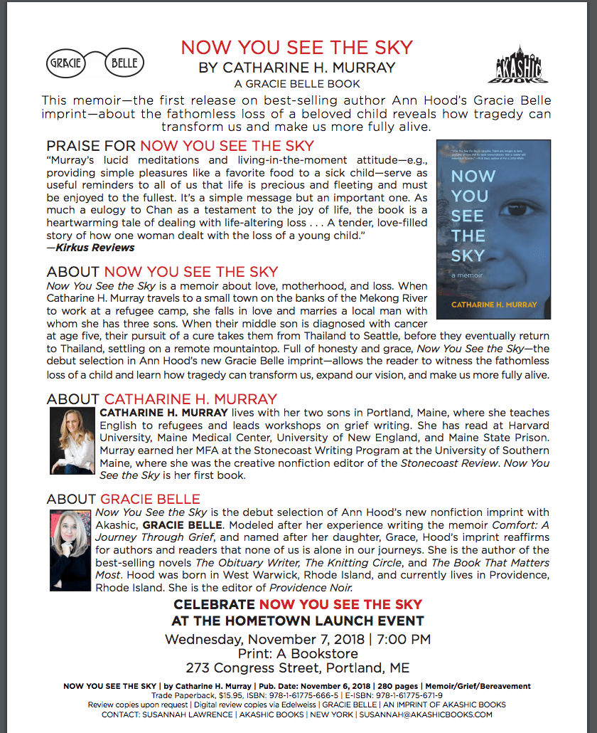 I am delighted to announce that Print: A Bookstore in Portland, Maine will host the release party for Now You See the Sky, which will launch Gracie Belle, a new Ann Hood imprint that will focus on grief and loss, on November 7th at 7 p.m.